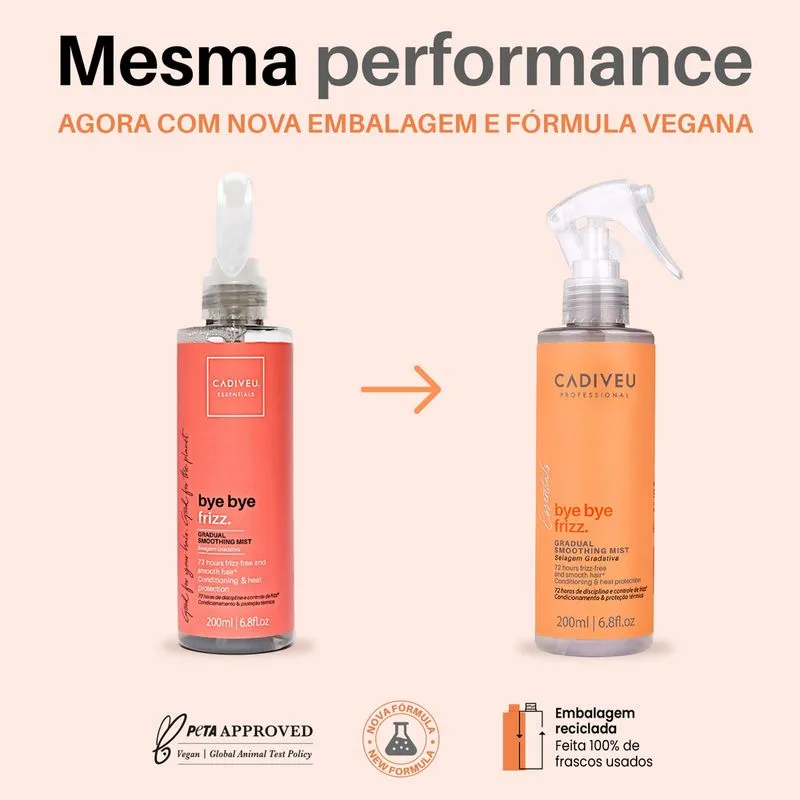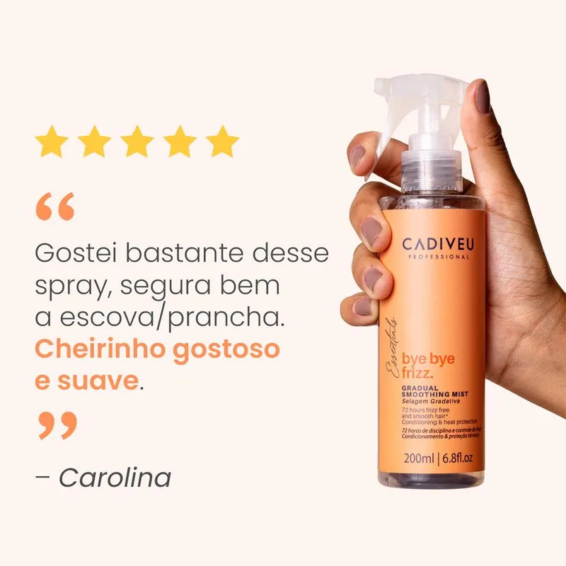 CADIVEU SPRAY BYE BYE FRIZZ é o leave-in ideal para quem busca um efeito antifrizz duradouro com tratamento intensivo e um acabamento profissional. Com fórmula vegana de alta performance, o produto promove uma selagem gradativa dos fios, garantindo até 72 horas de controle absoluto do frizz, mesmo em ambientes com alta umidade (até 70%).