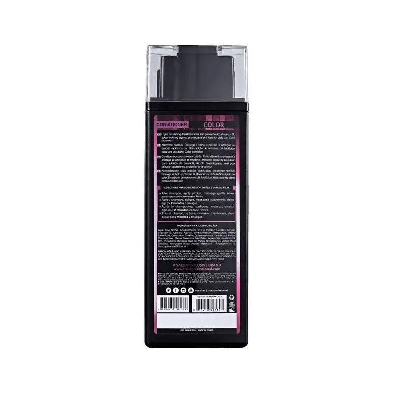 Modo de uso: Após lavar os cabelos com o shampoo da linha TRUSS COLOR, aplique o condicionador do comprimento às pontas. Massageie suavemente, desembarace os fios com os dedos ou pente e deixe agir por 2 minutos. Enxágue abundantemente.