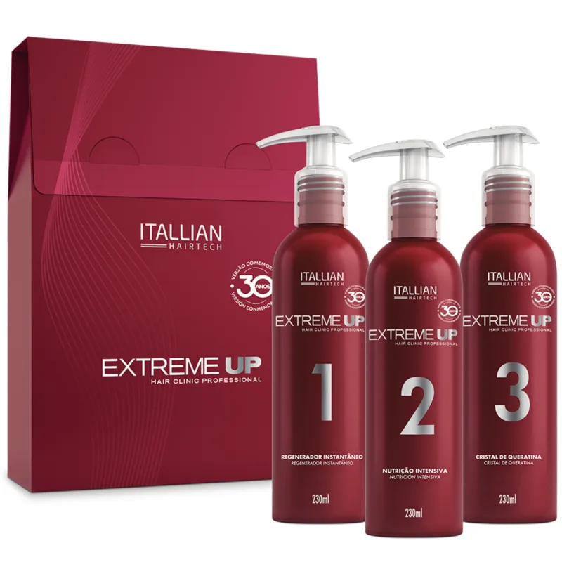 O ITALLIAN EXTREME UP KIT é um tratamento profissional de reconstrução capilar que entrega resultados visíveis e imediatos desde a primeira aplicação. Desenvolvido pela Itallian Hairtech, esse kit é uma edição comemorativa especial que reúne três produtos poderosos, formulados para atuar de forma sinérgica na recuperação de cabelos danificados, quimicamente tratados ou extremamente sensibilizados.