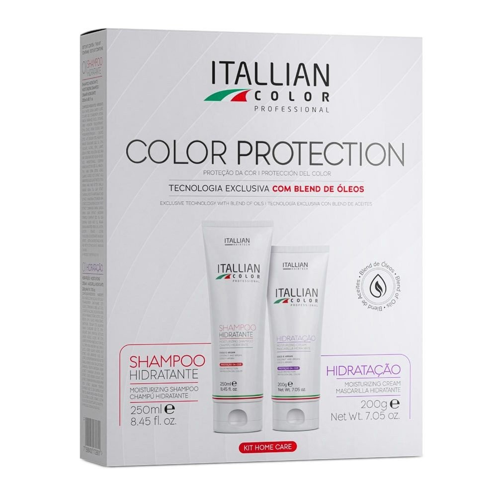 O ITALLIAN KIT COLOR PROTECTION foi desenvolvido para oferecer um cuidado completo e eficaz aos cabelos coloridos e quimicamente tratados, proporcionando uma manutenção profissional em casa. Composto por dois produtos poderosos – o Shampoo Hidratante Itallian Color 250ml e a Máscara de Hidratação Itallian Color 200g – o kit oferece uma rotina completa de lavagem e tratamento profundo com ativos ricos e altamente nutritivos.