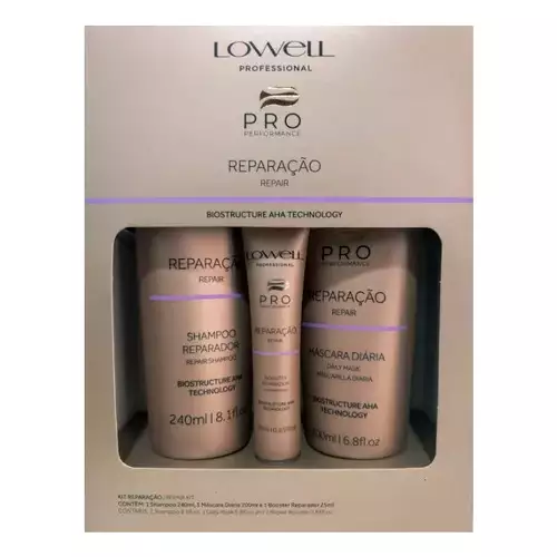 O LOWELL KIT REPARAÇÃO 3 PRODUTOS é um sistema de tratamento capilar da linha Pro Performance, especialmente desenvolvido para cabelos danificados por processos químicos, térmicos e mecânicos. Composto por shampoo, máscara e booster reparador, o kit oferece uma rotina de cuidados eficiente e poderosa, que reverte os danos, devolve a densidade, elasticidade e inibe a quebra dos fios.