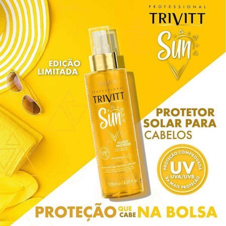 Proteção solar não é apenas para a pele! O produto TRIVITT SPRAY SUN 120ML, da linha Trivitt Sun da Itallian Hairtech, é um fluido protetor com filtro solar capilar que atua como escudo poderoso contra os danos causados pela exposição ao sol, água do mar e cloro da piscina.